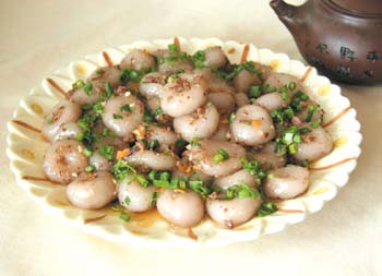 這是一道客家傳統(tǒng)小吃,既能做菜,又能當主食。別小看這道菜,要做到既彈又爽滑,熱吃、冷吃各有各的味道并非易事。算盤子是以木薯與芋頭淀粉為主要原材料制作而成,制作的技術難點在于攪拌材料時溫度的把握。在烹制時以香油、蔥、蒜蓉炒香,注意在起鍋時調味。