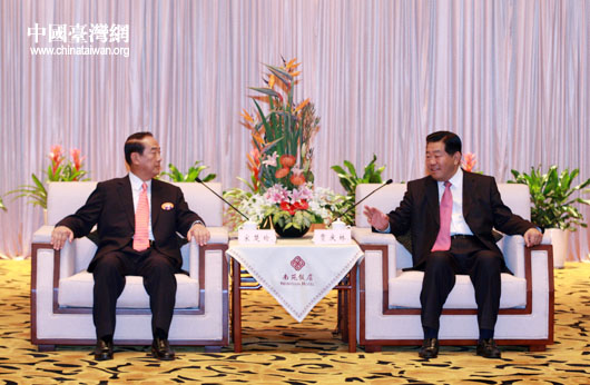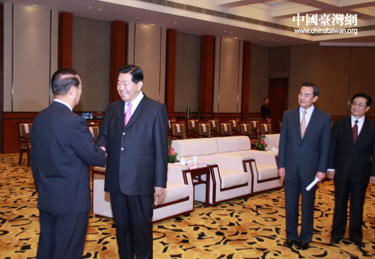 11月7日晚,中共中央政治局常委、全國政協主席賈慶林在寧波會見率團出席兩岸農漁水利合作交流會的親民黨主席宋楚瑜一行。(中國臺灣網 鐘寶華 攝)