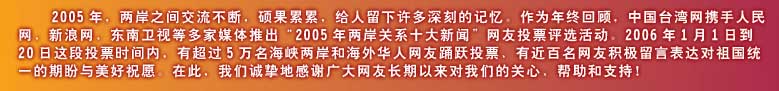 1月29日,2005年臺商春節(jié)包機(jī)啟動,首次實(shí)現(xiàn)了"共同參與、多點(diǎn)開放、直接對飛、雙向載客"。大陸民航飛機(jī)在兩岸分隔56年后,首度降落臺灣。 |