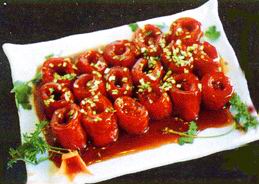 “九轉大腸”是山東濟南的傳統名菜。在清光緒年間,濟南九華林酒樓店主,把豬大腸(直腸)經洗刷后,加香料用開水煮至硬酥,取出切段,加醬油、糖、香料等調味,首先制成了香肥可口的“紅燒大腸”,贏得顧客的歡迎,逐漸聞名于市。后來在制作方法上又有所改進,即將洗凈大腸入開水鍋中煮熟后,先入油鍋中炸,然后再加調料和香料烹制,使“紅燒大腸”的味道更為鮮美。許多著名人士在該店設宴時均備“紅燒大腸”一菜。一些文人雅士食后,感到此菜確實與眾不同,別有滋味,為取悅店家喜“九”之癖,并稱贊廚師制作此菜像道家“九煉金丹”一樣精工細作,便將其更名為“九轉大腸”。從此“九轉大腸”一菜便馳名全省,成為山東最著名的菜肴之一。
