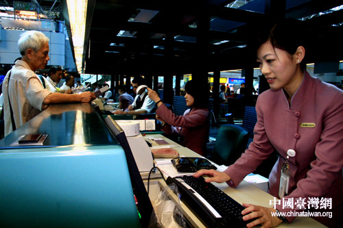 機(jī)場工作人員認(rèn)真熱情地為陸客辦理登機(jī)手續(xù)(攝影:李徽)