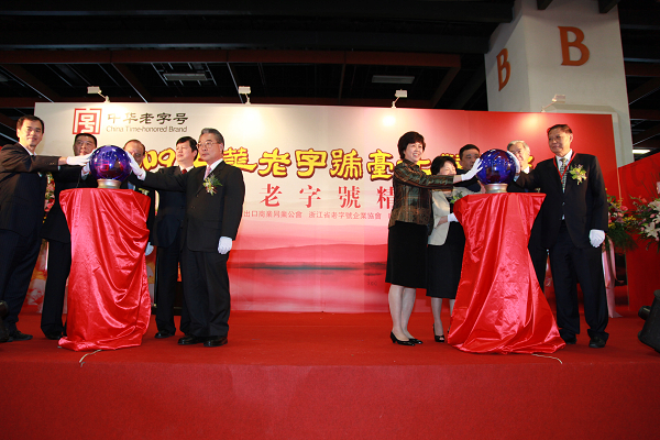 臺(tái)灣主持人首先向大家介紹參加這次開幕式的兩岸貴賓。然后,請臺(tái)北市進(jìn)出口商業(yè)同業(yè)工會(huì)理事長許勝雄、國民黨副主席林豐正、浙江省老字號(hào)企業(yè)協(xié)會(huì)會(huì)長馮根生、浙江省經(jīng)濟(jì)貿(mào)易委員會(huì)主任湯黎路等主要貴賓上臺(tái)致詞。在浙臺(tái)主要貴賓共同啟動(dòng)魔球中老字號(hào)精品展正式開始。