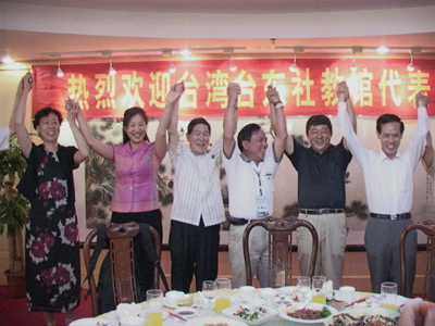 能歌善舞似乎是所有少數民族的共性,臺東花蓮地區被臺灣民眾稱為"島內最后一片凈土",是少數民族的聚居區。這次訪問團中也有幾位少數民族同胞,成為全團活躍氣氛的代表人物。王田明是萬榮社教站召集人,他所屬的民族排在島內少數民族的第十二位,居住在太魯閣旁,全族人口只有兩千余人,他也是我最先認識的幾位團員之一。因為該團訪津主要是進行津臺兩地的社會教育交流,每個參訪地點都是與社區群眾直接溝通交流,一路走來,王召集人總會給被參訪單位留下深刻的印象,不僅是因為他能歌善舞,更重要的是他的爽朗性格。在午飯時,組織全體團員帶動被訪社區的負責人,跳起早就排練好的少數民族舞蹈,每當熱舞后,王召集人總會幽默的說,"沒有舞蹈,宴會怎么能結束"。