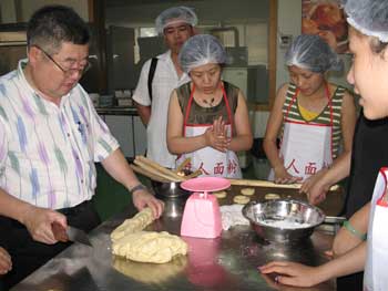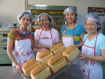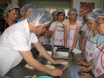 在聽(tīng)完張經(jīng)理有關(guān)面包的故事后,大家迎來(lái)了“夢(mèng)寐以求”的實(shí)際操作。只見(jiàn)大家戴上了大成公司事先為大家準(zhǔn)備好的嶄新潔白的圍裙,戴上白色的工作帽,這時(shí)的臺(tái)商太太們已昔如往日,儼然成為了“大師傅”的樣子。張經(jīng)理將大家分為了四組,在他的帶領(lǐng)下,來(lái)到了烘焙教室的操作廳。