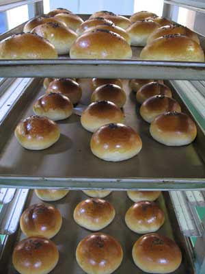 張經(jīng)理講述了全麥土司面包的制作方法,從攪拌、發(fā)酵、面團(tuán)整形到烤焙與冷卻。在聽(tīng)完張經(jīng)理的講述后,大家來(lái)到各組的操作臺(tái),在張經(jīng)理的示范下,將已經(jīng)用機(jī)器攪拌與發(fā)酵好的面團(tuán)進(jìn)行實(shí)際“面團(tuán)整形”操作工序。只見(jiàn)張經(jīng)理嫻熟的將一個(gè)大面團(tuán)分為6個(gè)450克的小面團(tuán),然后將每個(gè)小面團(tuán)團(tuán)圓后搟平,然后反方向卷起,成卷狀,面卷表面光滑兩端平整,然后將面卷放到烘焙槽內(nèi),此道工序完畢,大家看后興趣盎然,充滿著好奇,都想馬上一展身手?此坪(jiǎn)單的操作,可是自己真正操作起來(lái)就不像想象的那樣簡(jiǎn)單了。這時(shí)的面團(tuán)不像在張經(jīng)理手里那樣的“乖巧”了,就拿最簡(jiǎn)單的稱重來(lái)說(shuō)吧,將大面團(tuán)分為6個(gè)450克的小面團(tuán),只見(jiàn)大家用刀切一塊在秤上稱一下,不夠重,再切一小塊還不夠重,再切一小塊又超重了,再切下一塊,就這樣450克的面團(tuán)被大家分了好幾小塊才夠重量,這時(shí)的大家已經(jīng)沒(méi)有了那時(shí)“輕敵”的心態(tài)了,王梵明總經(jīng)理與張經(jīng)理又具體示范了成比例切面團(tuán)的方法,大家試過(guò)后很“見(jiàn)效”,雖然達(dá)不到王總與張經(jīng)理“一刀切準(zhǔn)”的境界,但是也是熟練了很多。面團(tuán)分割好后,將面團(tuán)搟平卷起,看大家卷的面團(tuán),真是千姿百態(tài),面卷的兩端參差不齊,在王總與張經(jīng)理一一修改后,漂亮的土司面包初具成形,這時(shí)的土司面包就可以進(jìn)烤箱了,大家都在翹首期盼勝利的果實(shí)。在等待土司面包出爐的過(guò)程中,張經(jīng)理與王總又給大家講述與示范了小的甜面包的制作方法,只見(jiàn)王總把小面團(tuán)放在操作臺(tái)上,用大拇指往里按壓轉(zhuǎn)了幾下,一個(gè)表面光滑圓圓的面團(tuán)成形了,大家看到王總的操作真是“出神入畫”,無(wú)不驚嘆!在制作土司面包的基礎(chǔ)上,大家有了一些經(jīng)驗(yàn),在切割面團(tuán)的時(shí)候已經(jīng)比較熟練了,但將面團(tuán)團(tuán)圓太不容易了,面團(tuán)在操作臺(tái)上根本不聽(tīng)大拇指的話,不是粘在操作臺(tái)上,就是不知面團(tuán)轉(zhuǎn)到什么方向去了,最后經(jīng)過(guò)相互揣摩其中的奧妙,汲取經(jīng)驗(yàn),總算是找到了技巧,一個(gè)個(gè)圓圓的面團(tuán)呈現(xiàn)在面前,大家充滿著喜悅。在操作過(guò)程中大家互相交流心得,相互鼓勵(lì),虛心向王總與張經(jīng)理求教,不僅學(xué)習(xí)了土司面包與甜面包的制作,還學(xué)習(xí)了可可酥及奶油酥的制作方法。下午3點(diǎn)30分,看到自己一天的成果-土司面包、甜面包、可可酥、奶油酥,太太們無(wú)不歡喜鵲悅,紛紛在自己的成果前合影留念,在分享喜悅的同時(shí),更是虛心求教,拿著自己的成果讓王總與張經(jīng)理點(diǎn)評(píng),汲取經(jīng)驗(yàn)改進(jìn)不足。下午4:30太太們帶著愉快的心情,載著自己豐碩勝利的果實(shí)結(jié)束了一天的烘焙培訓(xùn)活動(dòng)。