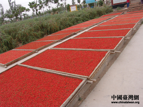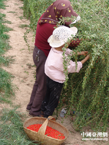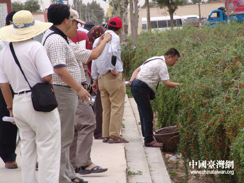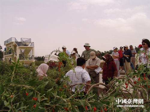7月10日,在寧夏參加“海峽兩岸記者聯(lián)合采訪活動”的兩岸記者一行參觀采訪中寧縣萬畝枸杞園。