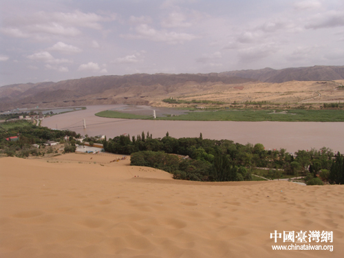 7月10日,在寧夏參加“海峽兩岸記者聯合采訪活動”的兩岸記者一行參觀游覽沙坡頭旅游區治沙工程。圖為記者乘羊皮筏在黃河漂流。