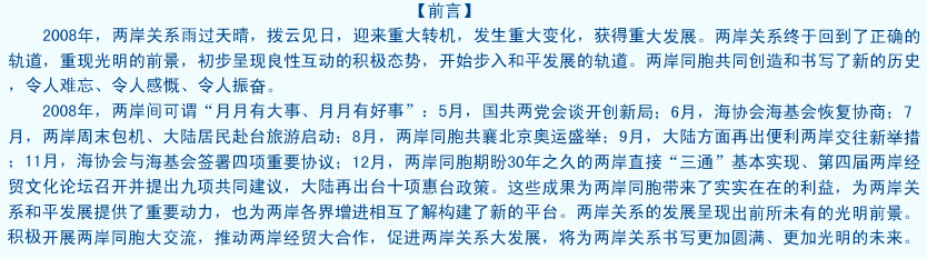 在第四屆兩岸經(jīng)貿(mào)文化論壇上,全國政協(xié)主席賈慶林就全面擴大和深化兩岸經(jīng)濟交流合作提出了5點建議。賈慶林指出:兩岸經(jīng)濟發(fā)展都面臨著國際經(jīng)濟金融形勢復(fù)雜變化帶來的嚴峻挑戰(zhàn)。兩岸雙方必須牢牢把握和切實用好兩岸關(guān)系發(fā)展難得的歷史機遇,自覺順應(yīng)兩岸同胞的愿望和要求,積極抓住有利因素,努力化解不利因素,全面擴大和深化兩岸經(jīng)濟交流合作,促進兩岸經(jīng)濟發(fā)展,更好地造福兩岸同胞。賈慶林表示如果世界經(jīng)濟形勢持續(xù)惡化,臺灣方面提出緩解經(jīng)濟困難的要求,大陸方面愿意盡最大努力,提供協(xié)助。中共中央臺辦主任王毅在第四屆兩岸經(jīng)貿(mào)文化論壇閉幕式上,宣布了加強兩岸合作、共同應(yīng)對國際金融危機,大陸各有關(guān)主管部門制訂的十項政策措施。王毅指出,兩岸同胞是一家人。對臺灣經(jīng)濟目前遇到的困難,我們感同身受。大陸有關(guān)部門還將進一步研究加強兩岸合作、攜手應(yīng)對國際金融危機的政策措施!救摹
