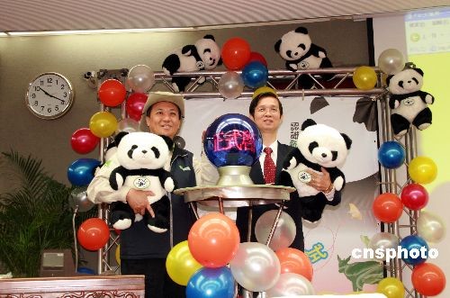 大陸贈臺大熊貓“團團”、“圓圓”即將來臺,臺北市立動物園12月5日開通專門網站“臺北大熊貓保育網”。圖為臺北市立動物園園長葉杰生(左)和臺北市教育局局長吳清山一起啟動網站。中新社發 周兆軍 攝
