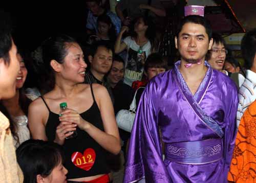 紅隊11號的漂亮小姐,受到眾男士青睞。最早給11號寫傳情卡片的綠隊23號帥哥,1米75左右的個,臉長得很有型,頭發被摩絲打得油光發亮,特有精神。他說,自己一上船對紅隊11號特有感覺。此時的紅隊11號,對面正坐著一個人高馬大的黃隊78號,兩人聊得甚歡。當綠隊隊長受委托把綠隊23號的卡片送至紅11號時,黃隊78號甚是驚訝且略帶“惱怒”,并當場微笑“叫戰”:“哪位帥哥來搶我美女,叫他來坐在我旁邊(比試比試)!”逗得紅隊11號忍笑不止。而綠隊23號,因為羞澀,顯得怯場,直等到黃隊78號離開,才與紅隊11號見面開聊。