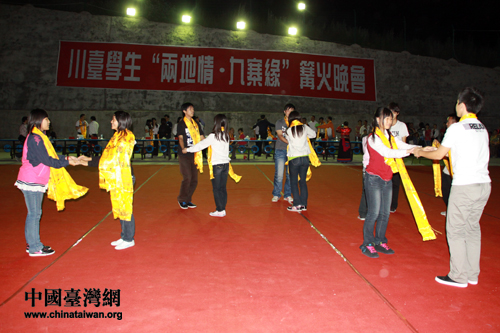 夜空下的九寨溝略顯寒意,溝漳扎小學的篝火旁卻暖意融融,倍感溫馨。在場的所有人跳起歡樂的鍋莊,享受著民族獨特的魅力。相信在未來的歲月中,在場的兩岸青年學子都會銘記住這個歡樂而難忘的夜晚。(中國臺灣網記者 王偉)