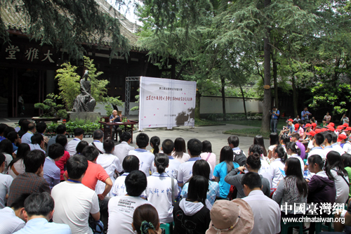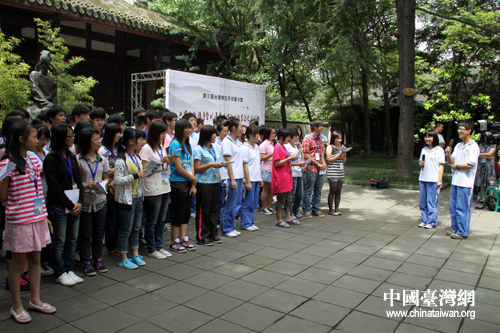 中國臺灣網7月4日成都消息 7月4日下午,參加第三屆“臺灣學生天府夏令營”活動的105名師生與成都七中的學生們一道漫步杜甫草堂,聽取巴蜀文化講座,共同吟誦“詩圣”杜甫的名篇佳作,感受中華文化源遠流長。