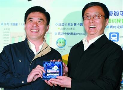 圖片說明:4月7日,臺北市長郝龍斌(左)向來訪的上海市長韓正贈送乘坐臺北捷運使用的電子車票悠游卡。