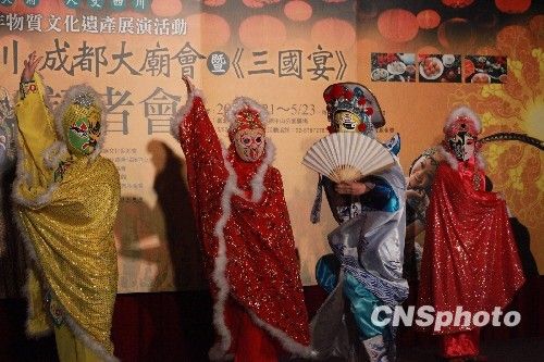 5月20日,來自四川的演員在臺北的成都大廟會記者會上表演川劇變臉。名列大陸四大廟會之一的四川成都大廟會,首度跨海來臺展示四川最具代表性的非物質(zhì)文化遺產(chǎn),21日將在臺北登場。中新社發(fā) 羅欽文 攝
