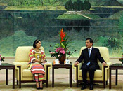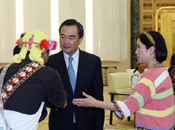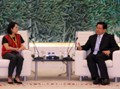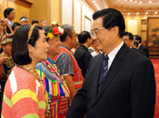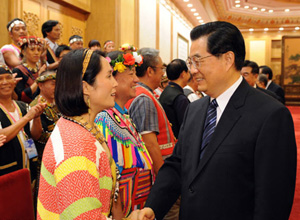 中共中央總書記胡錦濤19日下午在人民大會堂會見了高金素梅率領的臺灣少數民族代表團全體成員,并發表了即席講話。