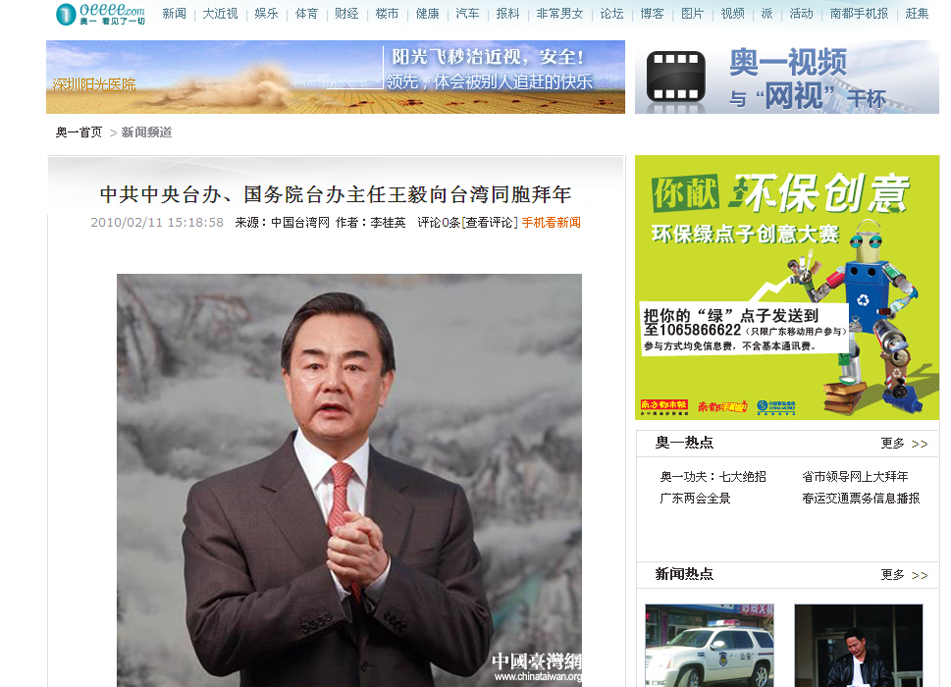 2010年2月11日,中共中央臺辦、國務院臺辦主任王毅通過中國臺灣網向臺灣同胞拜年。(中國臺灣網 田云鵬 攝)