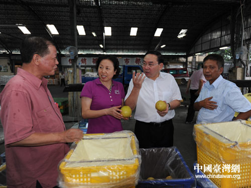中共湖南省委副書記梅克保(左三)、湖南省人大常委會副主任劉蓮玉(左二)一行來到卓蘭鎮(zhèn)農(nóng)會,現(xiàn)場考察水果儲藏包裝等工藝。(湖南省臺辦 李蘭 攝)