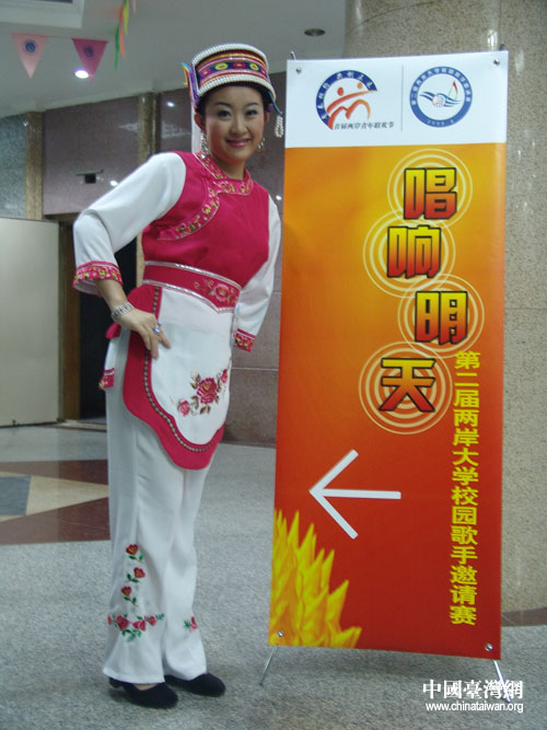 身著一身白族服飾,就讀于北京大學,正在念影視編導專業的大一女生林楠就是以一曲《八百里洞庭我的家》最終獲得了“唱響明天”兩岸大學校園歌手邀請賽的銀獎。她告訴記者,她之所以選擇這樣一首歌曲以及白族的服飾,就是為了向大家展示中華民族美麗的河山和風情。談到此次參賽的感受,她覺得臺灣的同齡人很親切,大家相處得很好,彼此之間在幾天的彩排中也結下了深厚的友誼。