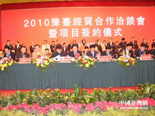 中國臺灣網10月26日鄭州消息 10月26日,作為“2010河南臺灣月”重要活動之一的2010年豫臺經貿合作洽談會簽約儀式在鄭州國際會展中心隆重舉行,共簽約182個項目,投資總額達528億元。中共河南省委常委、常務副省長李克出席會議并致辭,省委常委、統戰部長劉懷廉主持會議,副省長史濟春、國臺辦秘書局副局長王剛、商務部臺港澳司副司長高莉等出席了會議。