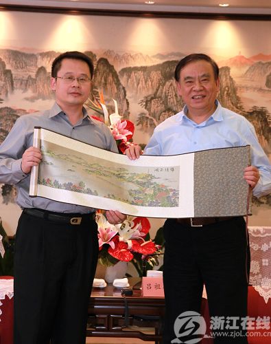 浙江省委副書(shū)記、省長(zhǎng)呂祖善向臺(tái)灣媒體聯(lián)合采訪團(tuán)贈(zèng)送禮品