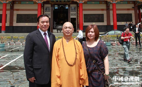 呂祖善與表妹及元亨寺住持在元亨寺前留影(浙江省臺辦 王健 攝)