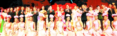演出結束后,徐光春等省領導及嘉賓上臺與演員一一握手,祝賀演出成功。臺灣各大媒體爭相報道演出盛況,在演出現(xiàn)場,徐光春愉快地接受了東森電視臺等媒體的聯(lián)合采訪。