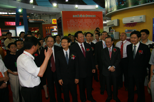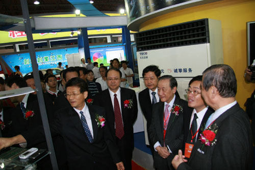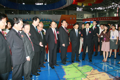 中國臺灣網8月30日江西消息 2007贛臺經貿研討會于8月28日-9月2日在江西南昌舉辦。有千余臺商及臺灣商界人士與會。29日上午舉行了“贛臺經貿合作成果展”啟動儀式。該圖為工作人員向領導和嘉賓介紹產品情況。(攝影:邵填)