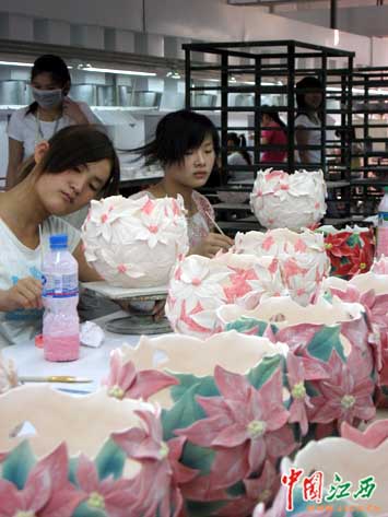 法藍瓷景德鎮生產基地座落在山水環繞間,廠區風光明媚,景色宜人。這是法藍瓷的理念——作坊像學校,學校像公園,公園像觀光景點。在這里,我們能看到偌大的職工生活區,有球場、娛樂室,等等。法藍瓷還專門為夫妻職工安排了夫妻宿舍,為中高層管理者配備了相應級別的住房,“以使他們的價值得到體現”,法藍瓷景德鎮生產基地的臺商劉崇禮經理告訴記者。