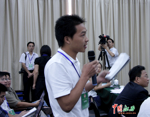 中國江西新聞網(wǎng)記者在記者見面會上提問。(江西網(wǎng)記者 何淳勇 攝)