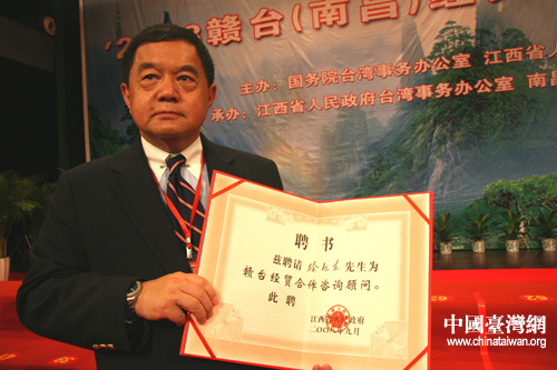 中國(guó)臺(tái)灣網(wǎng)9月22日南昌消息 今日上午,由國(guó)務(wù)院臺(tái)灣事務(wù)辦公室、江西省人民政府主辦的2008贛臺(tái)(南昌)經(jīng)貿(mào)合作研討會(huì)在南昌紅谷灘會(huì)議中心隆重開(kāi)幕。在開(kāi)幕式上,馬紹進(jìn)等16名臺(tái)商被聘請(qǐng)為贛臺(tái)經(jīng)貿(mào)合作咨詢顧問(wèn)。
