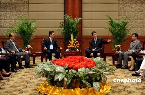 6月26日,國家旅游局副局長杜江在北京國際飯店會見臺灣中部四縣市負責人,臺中市市長胡志強、彰化縣縣長卓伯源、臺中縣縣長黃仲生、南投縣農業處處長陳朝旺。 中新社發 廖攀 攝