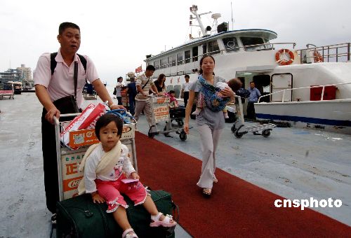 2007年九月二十四日,離傳統中秋佳節僅剩一天時間,廈(門)金(門)航線比平時顯的更加忙碌,臺商紛紛往返廈金兩地過中秋。 中新社發 王東明 攝