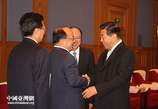 6月27日下午,中共中央政治局常委、全國政協主席賈慶林在北京會見了來京舉辦“臺灣中部四縣市農特產品暨觀光展覽會”的臺中市市長胡志強、彰化縣縣長卓伯源、臺中縣縣長黃仲生以及南投縣農業處處長陳朝旺等一行。
