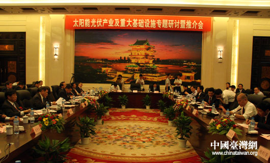 9月21日上午,由國務(wù)院臺辦和江西省政府共同主辦的“2009贛臺經(jīng)貿(mào)合作研討會(huì)”在南昌開幕。開幕后,兩岸工商企業(yè)代表就有關(guān)投資合作項(xiàng)目及協(xié)議現(xiàn)場簽約,隨后,江西省七個(gè)專題的研討暨項(xiàng)目推介會(huì)同時(shí)展開。圖為太陽能光伏產(chǎn)業(yè)及重大基礎(chǔ)設(shè)施專題研討會(huì)暨推薦會(huì)現(xiàn)場。(中國臺灣網(wǎng) 鐘寶華 攝)