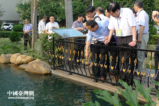 與會(huì)兩岸代表參觀臺(tái)資企業(yè)聯(lián)眾不銹鋼廠,圖為廠區(qū)利用冶鋼凈化水的生態(tài)魚(yú)塘(中國(guó)臺(tái)灣網(wǎng) 李徽 攝)