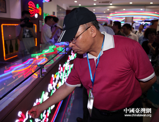 6月8日,兩岸專家學者組成的節能環保參訪團來到鶴山麗得電子實業有限公司餐館LED技術應用,圖為專家在觸摸可隨意彎曲的LED軟燈。(中國臺灣網 鐘寶華 攝)