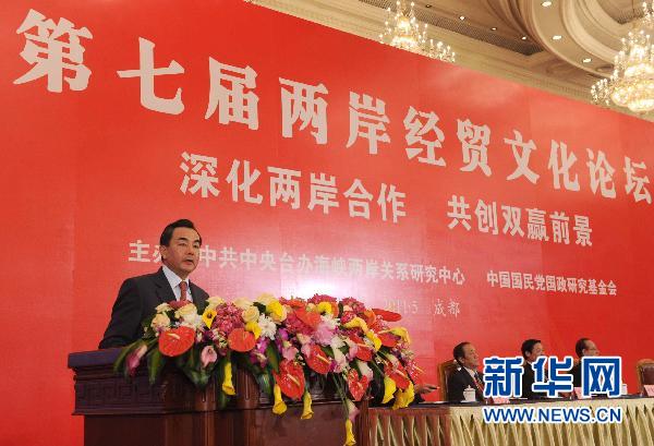 5月8日,第七屆兩岸經(jīng)貿(mào)文化論壇在四川成都閉幕。中共中央政治局常委、全國政協(xié)主席賈慶林和中國國民黨榮譽(yù)主席吳伯雄出席閉幕會。這是中共中央臺灣工作辦公室主任王毅進(jìn)行論壇小結(jié)。新華社記者 饒愛民 攝