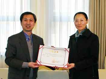 中國海洋大學副校長王琳(右)接受山東省臺辦頒發的2005年度山東省優秀對臺交流項目榮譽證書