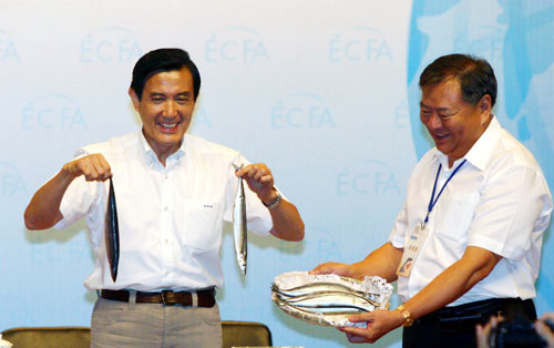 馬英九昨天到高雄市出席“兩岸經濟合作架構協議(ECFA)座談會”,與養殖、鋼鐵等業界座談。業者都非常感謝臺當局簽訂ECFA,讓業界獲益良多。受益的業者甚至提來一堆秋刀魚、石斑送給馬英九,讓現場響起熱烈掌聲。