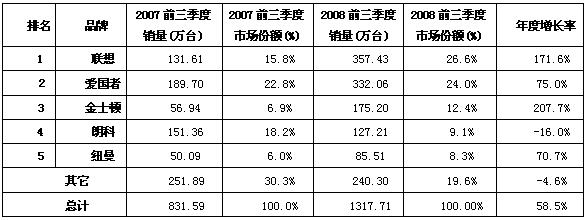 | 隨著當前人與人之間交流溝通日趨廣泛,社會信息傳遞日益頻繁,移動存儲市場迎來了發展的機遇期。但在奧運效應、宏觀經濟社會環境變化等因素的影響下,移動存儲市場又面臨著市場增長的挑戰。此時,盤點移動存儲市場2008年表現出的大趨勢,展望其在2009年可能出現的新跡象,顯得尤為重要。根據賽迪顧問發布的數據顯示:2008年前三季度,移動存儲市場共實現1488.08萬臺的銷售量和28.68億元的銷售額,與去年同期相比,增幅分別為54.00%與15.02%。