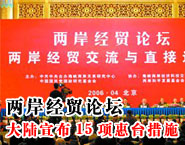 2006年,在兩岸同胞的共同努力下,兩岸經(jīng)濟(jì)交流與合作取得了新的積極進(jìn)展,走向一個(gè)范圍更廣、層次更高、關(guān)系更緊密的新局面。國(guó)共兩黨有關(guān)方面通力合作,分別于2006年4月和10月在大陸舉辦了兩岸經(jīng)貿(mào)論壇和兩岸農(nóng)業(yè)合作論壇系列活動(dòng),分別宣布了促進(jìn)兩岸交流合作、惠及臺(tái)灣同胞的15項(xiàng)政策措施及擴(kuò)大兩岸農(nóng)業(yè)合作、惠及廣大臺(tái)灣農(nóng)民的20項(xiàng)政策措施,在海內(nèi)外產(chǎn)生了廣泛的積極影響,帶動(dòng)兩岸經(jīng)貿(mào)活動(dòng)持續(xù)熱絡(luò),并取得實(shí)實(shí)在在的成效……
