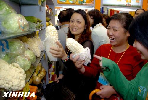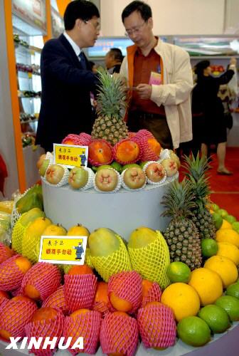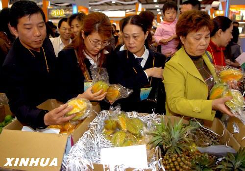 5月18日,第八屆海峽兩岸經(jīng)貿(mào)交易會在福州市會展中心舉行。此次海交會擴(kuò)大了臺灣農(nóng)產(chǎn)品的種類和范圍,參展的臺灣農(nóng)產(chǎn)品包括新增的4種零關(guān)稅臺灣水果、11種臺灣蔬菜和近300種臺灣深加工農(nóng)副產(chǎn)品。零關(guān)稅臺灣水果、蔬菜等農(nóng)產(chǎn)品又一次受到榕城市民的青睞。為擴(kuò)大臺灣農(nóng)產(chǎn)品在大陸銷售,自2006年5月1日起,零關(guān)稅臺灣水果準(zhǔn)入品種由18種擴(kuò)大到22種, 同時(shí)準(zhǔn)入的還有蔬菜品種11種和部分水產(chǎn)品。(新華社 張國俊 攝)