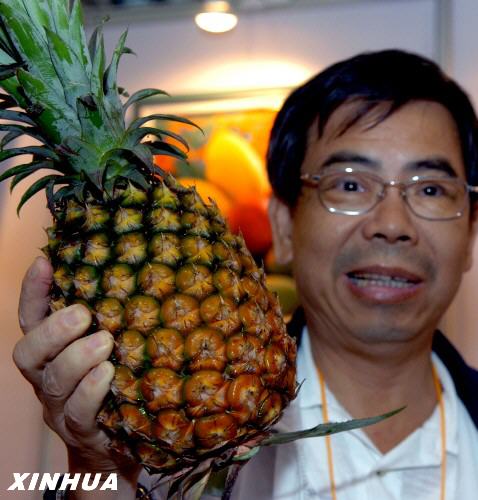 5月18日,臺灣果商曾永長先生在第八屆海峽兩岸經(jīng)貿(mào)交易會上展示臺灣鳳梨。 |