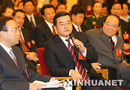 10月16日,中共十七大代表、國防科工委主任張慶偉說,舉世矚目的繞月工程總體準備情況良好,正在進行10月下旬首飛發射前的各項準備工作。這是張慶偉(前中)就繞月工程回答記者提問。 新華社記者 黃敬文 攝
