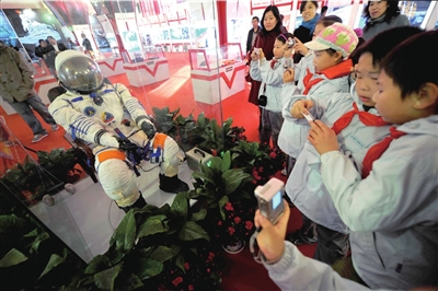 來自西城區奮斗小學的數十名孩子成為開幕后的首場觀眾,他們紛紛在航天服前合影留念。一名小航天迷說,他2005年就跟隨媽媽到航天城見過偶像楊利偉,之后便和同學組建了航天中隊,他們經常組織活動,并與載人航天運載火箭系統總指揮黃春平、美籍華裔航天員焦立中等人見過面,“我們的夢想就是成為一名真正的航天員。”(記者 李琦)