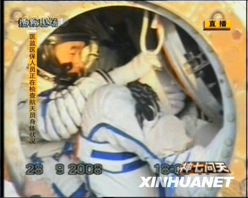 9月28日,神七返回艙艙門打開。航天員準(zhǔn)備出艙。新華社發(fā)(電視截圖)