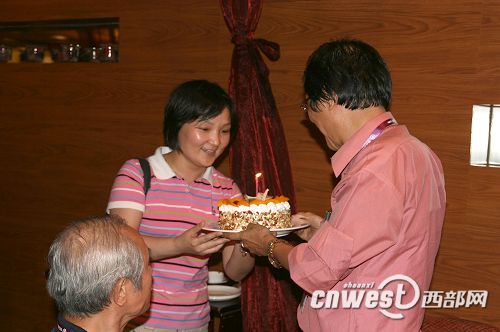 西部網(wǎng)訊 7月16日晚,參加“情系長安——兩岸文化聯(lián)誼行”大型活動(dòng)的臺灣中華文物保護(hù)協(xié)會理事長莊芳榮在觀看完華清池大型真山真水實(shí)景歷史舞劇后,在晚宴上收到一份驚喜。原來,7月16日是莊芳榮先生的六十三歲生日,作為活動(dòng)承辦方,陜西省臺灣事務(wù)辦公室的工作人員在晚宴為莊先生特意準(zhǔn)備了生日蛋糕,并號召現(xiàn)場所有嘉賓為莊先生唱起生日快樂歌。這個(gè)特別的安排讓莊先生倍感溫暖。莊先生告訴記者,自己非常感謝活動(dòng)組織方的細(xì)心和貼心,是他們讓自己在陜西度過的這個(gè)生日將變得非常難忘。