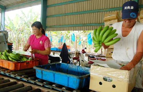 圖:臺灣青果運銷合作社高雄分社集貨場昨日將收購的香蕉進行嚴格篩選、水洗、裝箱,準備運往大陸(轉自香港大公報)