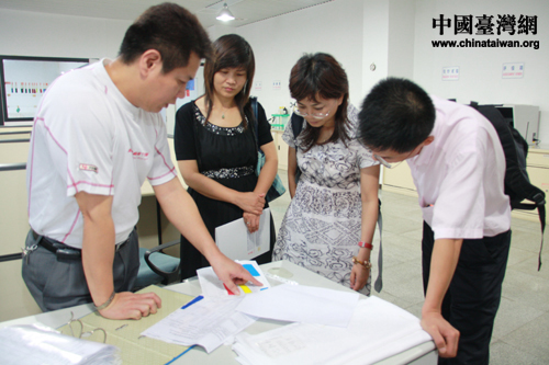 鵬程實業有限公司管理人員陪同臺企轉型升級服務團及專家觀看企業宣傳片。(中國臺灣網 胡珊珊 攝)