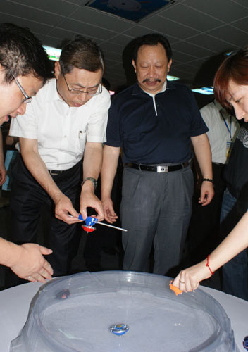 海基會副董事長高孔廉 (左2)試玩杭州中南卡通創(chuàng)作卡通陀螺周邊商品。圖片來源:“中央社”